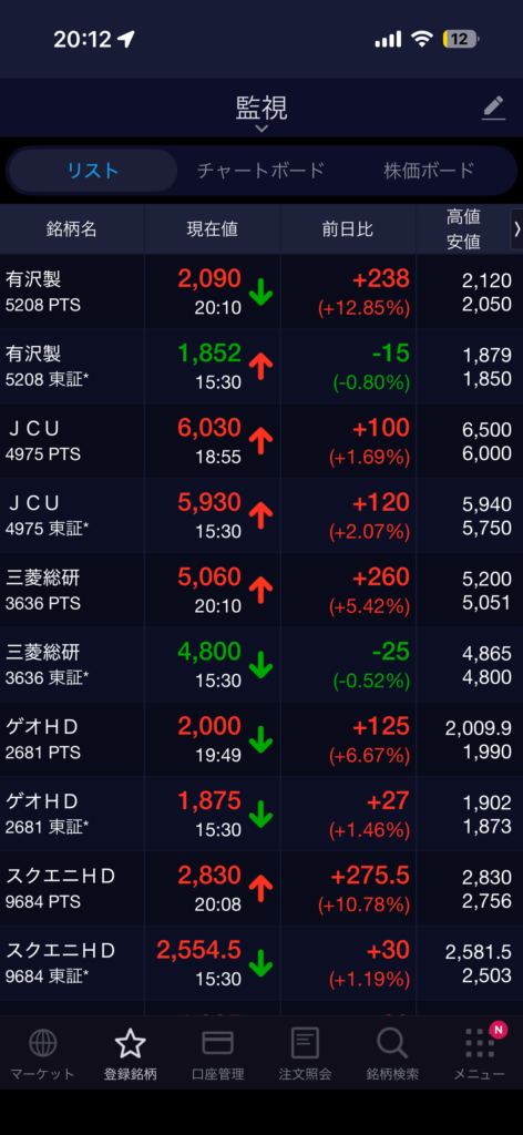 記事を書いてすぐにPTS(夜間取引)を確認したところ、ピックアップした銘柄にさっそく大きな反応が出ています!市場の反応は本当に正直ですね。