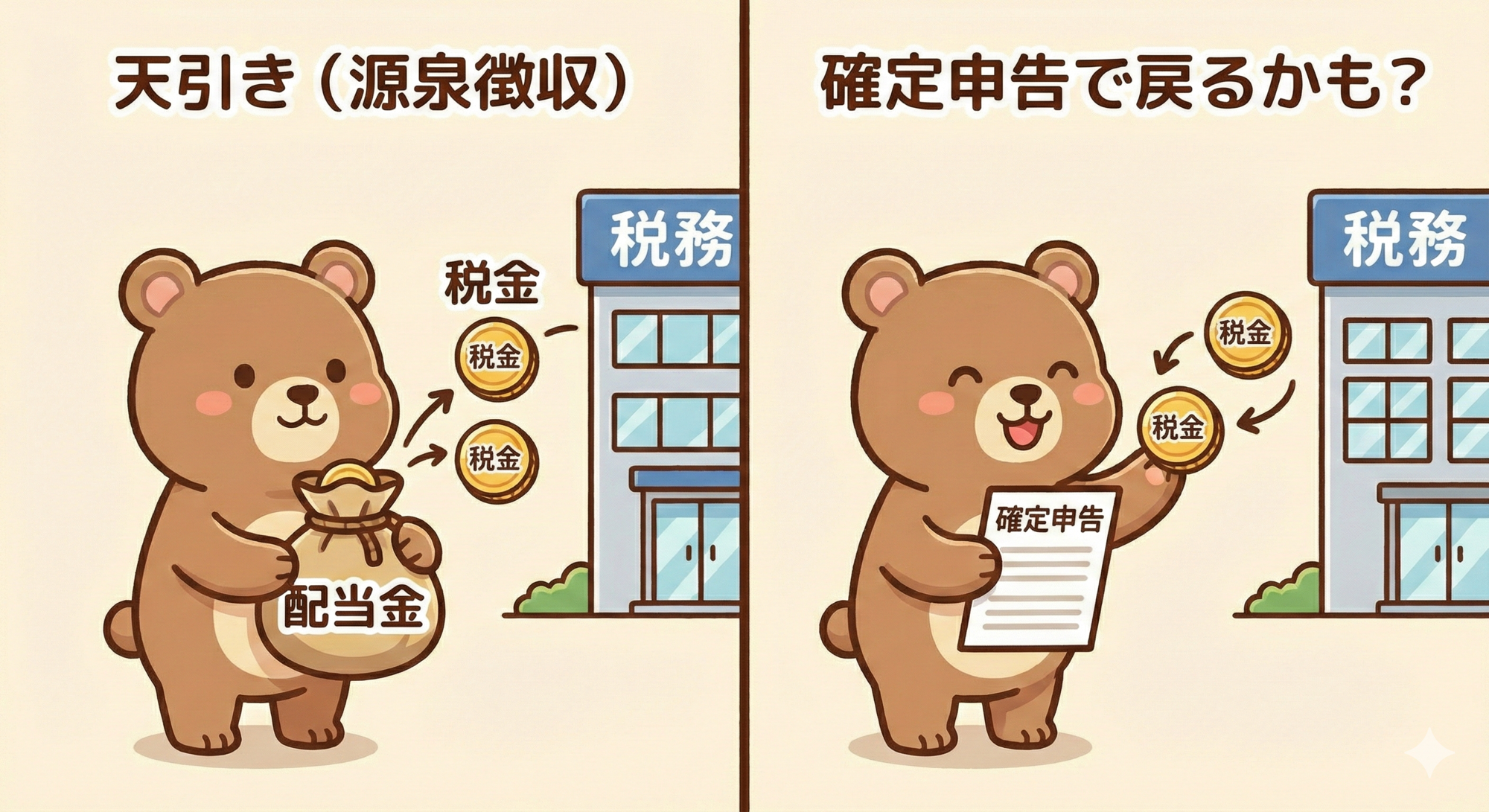通常、上場株式の配当金を受け取る際、すでに20.315%(所得税15.315%+住民税5%)の税金が天引き(源泉徴収)されています。