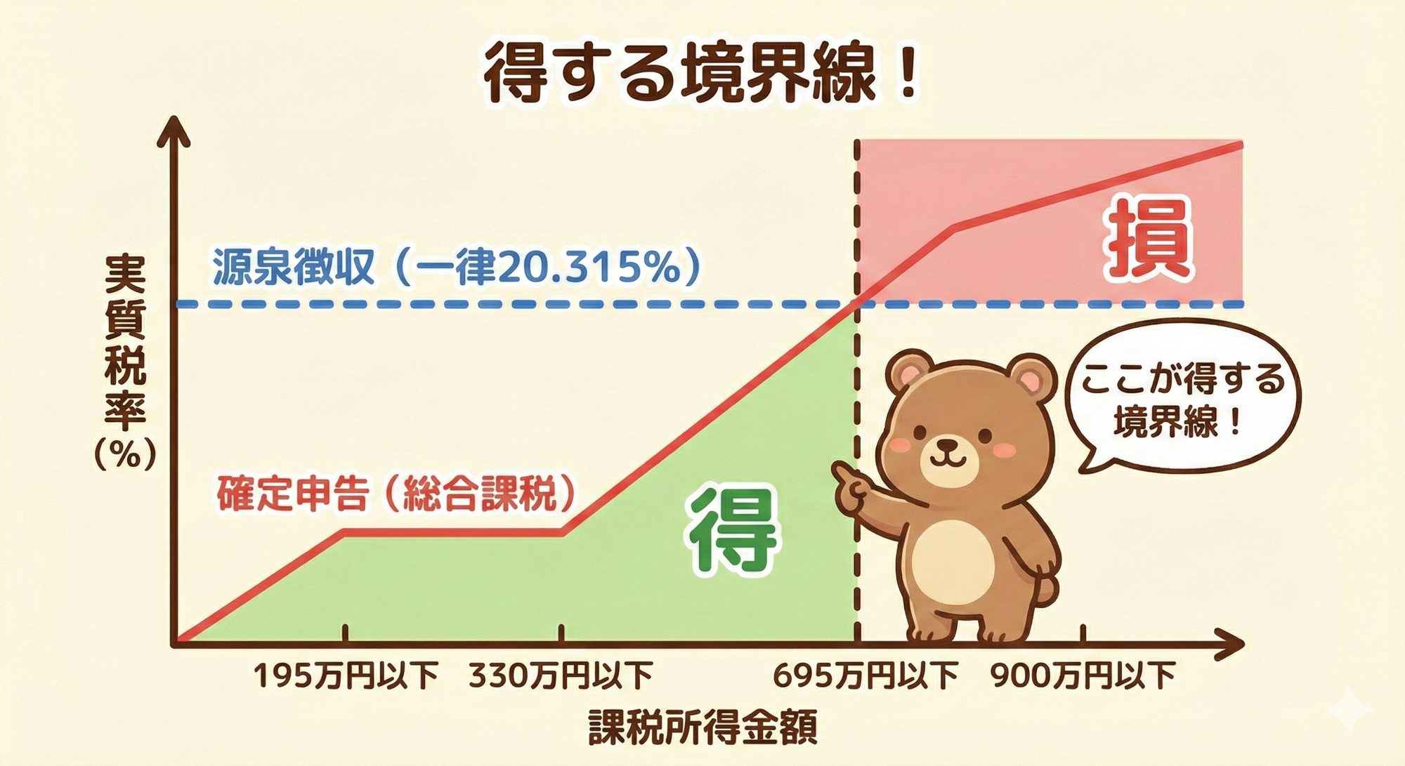 日本の所得税は累進課税(5%〜45%)なので、配当金を足したことで所得区分が上がり、結果として源泉徴収の15%よりも高い税率が適用されてしまう可能性があります。