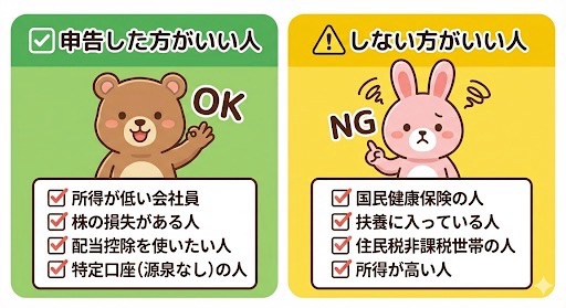 ※会社員の社会保険料は給与額で決まるため、個人的に株の申告をしても保険料は上がりません。 - 株の売却損(譲渡損失)があり、配当金と損益通算したい人