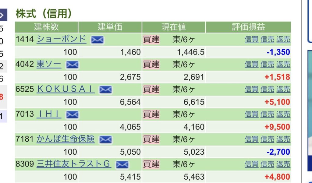 大黒柱となっている「IHI」と「三井住友トラストG」については、含み益がしっかり乗ったため、損切りラインを「自分の買値(建単価)」に引き上げました。