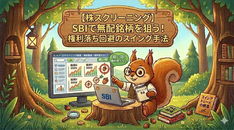 こんにちは!短期・スイングトレードでコツコツと利益を積み上げているパパです。 スイングトレードをしていて、「順調に利益が乗っていたのに、月末にいきなり大きな窓を開けて急落した!」という悔しい経験はありませんか?その正体は … 続きを読む 【株スクリーニング】SBI証券で無配銘柄を狙う!権利落ち回避のスイング手法